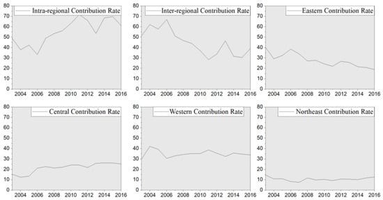 The decomposition contribution rate of Theil Index of UICE in China’s different regions from 2003 to 2016.