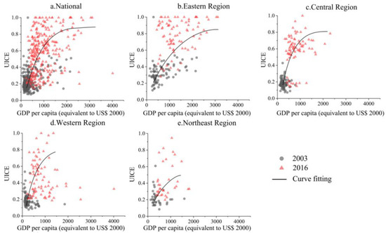 Fitting curves of UICE and per-capita GDP in China from 2003 to 2016.