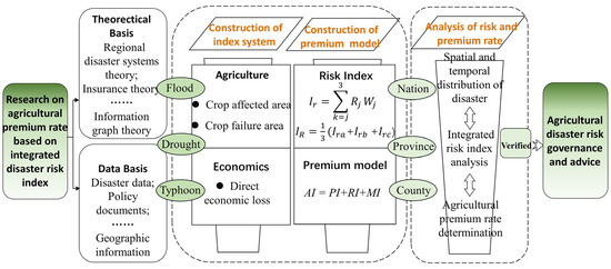Based on the theoretical foundation of the regional disaster system, insurance, and geographic information mapping, as well as the database of disaster, geographic information, and policy literature, this study carries out research on agricultural risks and agricultural premium rates. The technical route is as follows (Figure 1).
