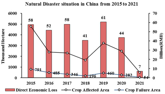 From 2015 to 2021, the losses of natural disasters (floods, droughts, and typhoons) suffered by the country over the years show a fluctuating downward trend (with slight ups and downs in between). The crop-affected areas ranked in the first three years were 4.8 × 106 hm2 in 2015, 3.2 × 106 hm2 in 2019, and 2.5 × 106 hm2 in 2020, respectively. The crop-failure areas ranked in the first three years were 7.9 × 105 hm2 in 2015, 4.9 × 105 hm2 in 2016, and 4.6 × 105 hm2 in 2019. The highest direct economic losses were 60.6 billion RMB in 2019, 58.2 billion RMB in 2017, and 57.8 billion RMB in 2015 (Figure 2).