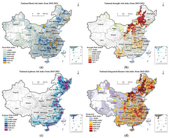 The national integrated disaster risk index is divided into five levels: extremely high risk (>0.1), high risk (0.03–0.1), medium risk (0.01–0.03), low risk (0.001–0.01), and extremely low risk (<0.001). The flood risk from 2015–2021 is generally characterized by a spatial distribution of high risk in central and northeast China, and some counties in Jilin Province, Inner Mongolia Autonomous Region, Hubei Province, Hunan Province, Anhui Province, and Jiangxi Province are in high flood risk areas. The drought risk generally shows a spatial distribution characterized by high risk in the north, central, and southwest, with some districts and counties in the provinces of Liaoning, Inner Mongolia, Shanxi, Hubei, Henan, Anhui, Jiangxi, Yunnan, Gansu, and Ningxia in high-drought risk. The typhoon risk generally shows the spatial distribution characteristics of a high index in coastal and northeastern regions, with coastal districts and counties in Shandong, Jiangsu, Zhejiang, Fujian, and Guangdong provinces, and some districts and counties in the junction of Jiangsu, Anhui, and Henan as well as southern Heilongjiang in the high-risk area of typhoon hazard (Figure 5a–c).