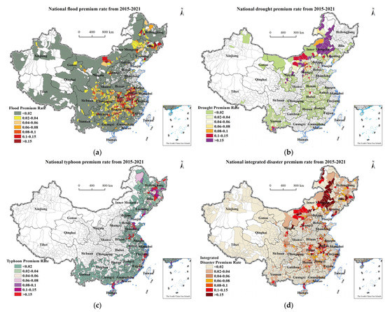 National agricultural premium rates based on the integrated disaster risk index are divided into 5 grades of extremely high rate (>0.15), high rate (0.08–0.15), medium rate (0.06–0.08), low rate (0.02–0.06), and extremely low rate (<0.02). From 2015 to 2021, the overall distribution characteristics of the agricultural premium rates of counties affected by flood were similar to that of the flood risk index. In addition, some counties in eastern Jilin, central Inner Mongolia, eastern and southern Hubei, southern and northeastern Hunan, most of Anhui, and central and northeastern Jiangxi Province are in the high-level of the flood agricultural premium rates. The overall distribution pattern of agricultural premium rates of drought is similar to that of the drought risk index. Some counties in northeastern and central Inner Mongolia, northern Shanxi, southeastern Gansu, eastern Ningxia, and southern Yunnan are at a high level of drought agricultural premium rates. The overall distribution law of agricultural premium rates of typhoon is similar to that of the typhoon risk index, with high agricultural premium rates in some counties in Shandong, Zhejiang, Fujian, Guangdong, Heilongjiang, Jiangsu, Anhui, and Henan (Figure 6a–c).