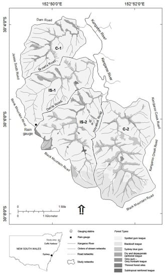 The topography involves a range of gradients with steep mountainous slopes and mainly V-shaped valleys to moderately sloping natural terraces. The study area generally has a north-eastern aspect and elevation ranges from 160 m above sea level at the most downstream point to 560 m at the highest ridgetop. The region generally has a subtropical climate that is moderated by the maritime influence of the Pacific air mass [28]. Geology is dominated by Carboniferous Coramba beds comprising lithofeldspathic wacke, minor siltstone, siliceous siltstone, mudstone, metabasalt, chert and jasper, with rare calcareous siltstone and felsic volcanics [29,30]. Soils are mostly shallow and are mixed with roots and gravel particularly on steep hillslopes adjacent to streams. Soil landscapes in the study area are generally Black Mountain with lesser areas of deep (>150 cm) well-drained Yellow Earths formed on siltstones. The Black Mountain soil type consists of loamy and occasionally silty textures in the A horizon together with clay loam and commonly silty textures in the B horizon. Moderately deep to deep (>100 cm) well-drained Yellow Earths and Brown Earths occur on other lithologies [31]. The dominant vegetation type is a mixed species of native evergreen Eucalyptus forest occupied by a dense layer of understorey [30]. This forest type covers most of the area and includes five main species (Corymbia maculata, Eucalyptus saligna, E. pilularis, E. grandis, and E. paniculata) with the addition of minor species along drainage lines. In the current study, the impacts of single-tree logging operations (carried out over a few months in parts of IS-1 and IS-2) were disregarded.