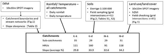 Of the spatial parameters, slope steepness of the catchments was classified into three groups for areas having <35, 35–45 and >45% by which varying topographic heterogeneity were equally included within each category. Of the four catchments, C-1 had the lowest mean slope length, gradient and steepness; and IS-2 had the highest mean slope length, gradient and steepness (p < 0.05) [21] (Table 2).