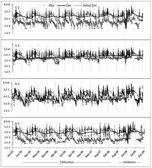 Visual assessment of the observed daily records (2003–2009) against initially simulated and calibrated hydrographs for the periods of calibration (2003–2008) and validation (2009) is presented in Figure 4 for each catchment outlet. Overestimation of initially simulated hydrographs was optimised by repeated calibrations, although the calibrated model still overestimated daily streamflow in all four catchments. The dynamics (rising and falling limbs) of the simulated hydrograph did not overlay properly with the observations in C-1, IS-2 and particularly with the furthest catchment from the rain gauge, C-2. However, the modelling of streamflow in IS-1 produced good results not only for low flows but also during peak streamflows. The single rain gauge was located on hilltops of IS-1 and a great deal of uncertainty was apparent for sites located further from the rain gauge. Authors [63] also noted that lack of a gradient resulting from the use of interpolated rainfall distributions, rather than data recorded from several gauges, may add to model uncertainty.
