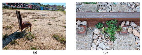 State of abandonment of the public space of the PVF: (a) surroundings of the Delicias station; (b) wild flora on the roads. Photos by Ramón Gómez of Herba Nova for the TRAHERE project.