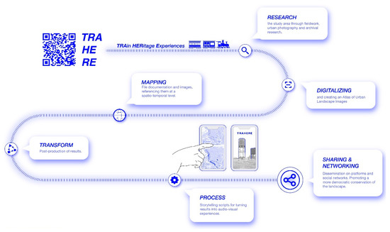 These starting conditions allow us to apply and validate our methodology through a study and rigorous analysis of the area and through a proposal for the future linked both to the river and to the postproduction of the results, which will in turn be disseminated to and exchanged with the public and the institutions through social networks. In this way, the aim is to turn the TRAHERE project into an operational tool for exchanging knowledge focused on the shared care of the urban landscape, which entails a change in the methodology of the research, as will be explained later (Figure 2).