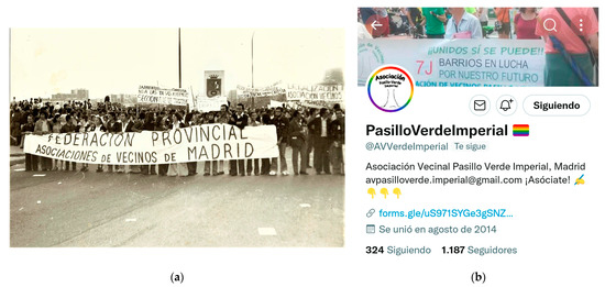 Activism of neighborhood associations of Madrid after the Democratic Transition. (a) First protest of the neighborhood associations of Madrid in 1977 (Archivos de la Transición [18]); (b) an example of the presence of neighborhood associations on social networks: the current profile of the Pasillo Verde Imperial Association on Twitter.