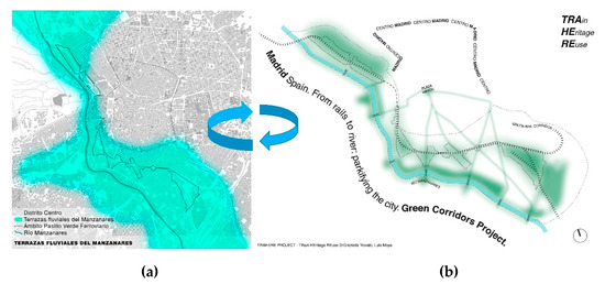 Two diagrams that synthesize the circularity proposal. (a) The scope of the PVF in the old fluvial terraces of the river. The following are distinguished: the downtown district, the area of the PVF, and that of the old terraces. (b) The proposal for the connection project between the PVF and Madrid Río “Towards a desirable circularity”. Source: TRAHERE’s own elaboration.