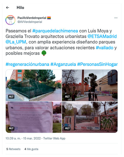 - Material obtained from fieldwork carried out throughout the research process. As we stated previously, part of this process was carried out with the Pasillo Verde Imperial Association via actions organized through its social networks (mainly Twitter and Instagram) (Figure 6).