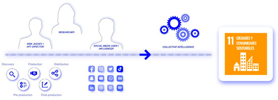Figure 8. Conceptual diagram of the research method in which the postproduction work was combined with a presence on social networks. The purpose was collective intelligence and ultimately the Sustainable Development Goal 11, which refers to cities, within the 2030 Agenda. Source: TRAHERE’s own elaboration.