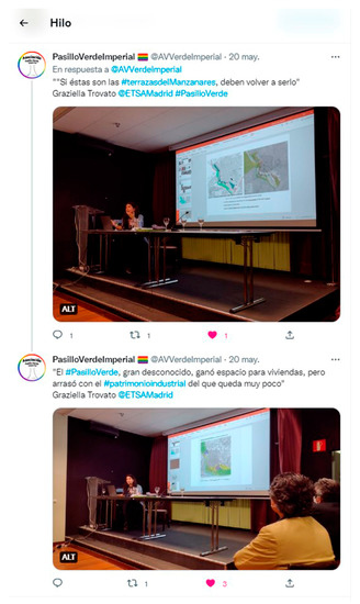 The presentation of the book Madrid, Between River and Rails [19] through a Twitter thread of the Neighborhood Association. The images show a projection screen with the PVF study area, analysis, and proposals. The neighbors shared and made the information and the objectives of the research their own. The tweets read: “ ‘If these are the #ManzanaresTerraces, they must be so again’ Graziella Trovato @ETSAMadrid #PasilloVerde” and “ ‘The #PasilloVerde, a great unknown, gained space for housing, but destroyed the #industrialheritage of which very little remains’ Graziella Trovato @ETSAMadrid”.