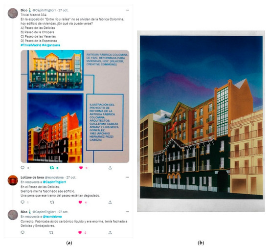The project has been shared on social networks by citizens. For some, it offers an opportunity to reflect on the city’s past and its transformations with a certain nostalgia for its lost heritage. Sometimes it is carried out through play: this is the case of Bico, who poses riddles about singular patrimonial elements little known by the public. In his tweets, he provides data related to his recollections. In this instance, he shared one of the panels from the exhibition “Between the river and rails” with images of the old Colomina factory on Paseo de las Delicias that was transformed into a residential building in 1982 by Luis Moya and Guillermo Cabeza [23]. Bico specifies that Colomina manufactured liquid carbonic acid and was huge, facing two streets (Delicias and Embajadores) (Figure 13).