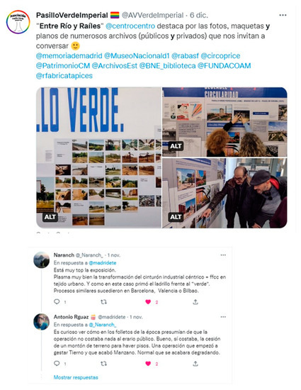 Twitter thread by the Asociación Pasillo Verde Imperial that included photos of neighbors visiting the exhibition. A debate was generated around the “zero cost” management model and the state of abandonment. Two neighbors indicated the photo of the authorities in the presentation of the PVF model. Among the comments can be read the following: Naranch replying to @madridete: “The exhibition is very top. It captures very well the transformation of the downtown industrial belt +ffcc into urban fabric. And how in this case, brick prevailed over ’green’. Similar processes took place in Barcelona, Valencia or Bilbao.”; Antonio Rguaz: “It is curious to see in the brochures of the time how they boasted that the operation did not cost the public treasury anything. Well, it did cost the transfer of a lot of land to build flats. An operation that Tierno (Enrique Tierno Galván) began to develop and that Manzano ended. No wonder it ended up degrading.”.