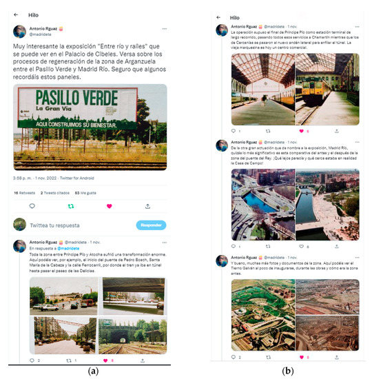 (a,b) Twitter thread from a citizen who made the story about the PVF his own and enriched it with his memories. (a) It reads: “The Exhibition Between River and Rails that can be seen in the Palacio de Cibeles is very interesting. It deals with the regeneration processes of the Arganzuela area between the Green corridor and Madrid Río. Surely some of you remember these panels” (…) “The whole area underwent a huge transformation. Here you can see, for example, the beginning of Pedro Bosch, Santa María de la Cabeza and Ferrocarril street, where the train used to go underneath a tunnel until it passed Paseo de las Delicias”.