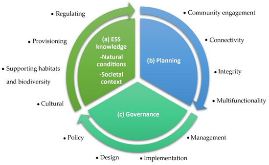 We adopted (a) ESS knowledge, (b) planning and (c) governance as a central framework for our research investigation to discover the challenges of consideration and application of multiple ESS in Canberra’s GI planning and governance practices (Figure 2).