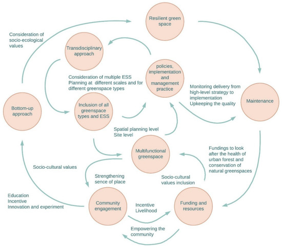To strengthen the GI network considering social and ecological factors we need to adopt a comprehensive approach that recognises all types of green spaces and considers multiple ESS. It means that it is necessary to include different land-uses and land ownership, for example, private properties, industrial and post-industrial landscapes [79]. Accordingly, all potential green spaces at different scales with cultural values and environmental benefits should be identified to delineate a robust GI plan. Different types of nature (designed, native and informal) and the nativeness potentials in GI planning and governance need further research [35,80]. For instance, the potential of private land-uses in GI planning can be incorporated into GI planning by developing policies and guidelines [57].