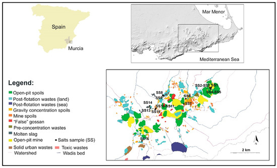 This area covers approximately 50 km2. Argentiferous galena (PbS, Ag), sphalerite (ZnS) and pyrite (FeS) have been mined from the 3rd century BC until 1991 AD [30,31]. Today, this former mining area is made up of some 89 large tailings and flotation waste, and a plethora of smaller tailing piles of different types that make up over 2300 tailing sites scattered throughout the mining area [32]. A large part of the hundreds of millions of tons of metallic sulphides, limestone and other geological materials extracted over centuries are distributed among all these deposits, of which some 350 million tons were mobilised in the last 20th century alone [32]. This exploitation gave rise to the mobilisation of metals and metalloids such as Zn, As, Cd and Pb as the most important elements from an environmental point of view, along with others such as Ni, Cu, and Sb, among others [20]. This has resulted in a dangerous environmental situation, insofar as the PTEs associated with these tailings generate supergene mineral phases in the form of saline efflorescences that affect both the population and the ecosystems surrounding the mining area.