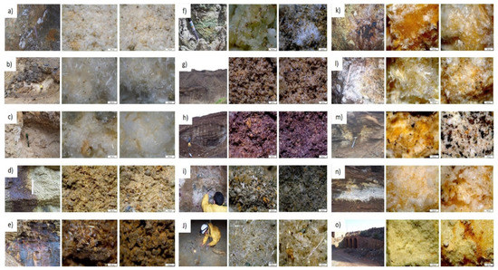 Supergene minerals were identified from the mining waste deposits. They were composed of ochre-coloured precipitates, efflorescent salts and other weathered geological types that underlie these secondary sulphate minerals, of which sulphides make up a significant component of stony materials. The general appearance of the different salt efflorescences is shown in Figure 2 both at the time of collection and under the stereomicroscope a few days later. Many of the salt samples were taken from exposed vertical surfaces facing north, which were shielded from both sunlight and rainfall, protecting them from dramatic fluctuations in humidity and temperature.