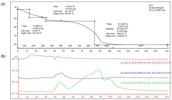 An example of thermogravimetric analysis (for sample SS13): (a) thermogram, (b) ionic current plot of gases generated during the sample breakdown, where the red line stands for water profile, the blue line for carbon dioxide and the green line for sulphur trioxide (SO3).