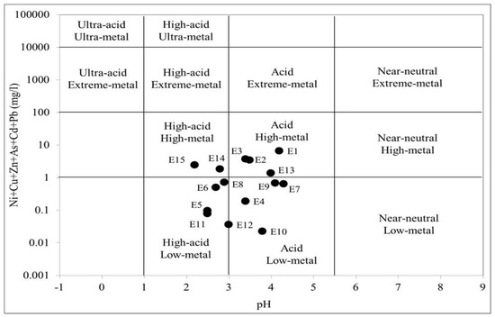 A Ficklin diagram was generated to categorise the leachates obtained from the leaching tests [38,39,40]. The Ficklin diagram is often used to analyse chemical changes in mineral solutions of different origins. It is a scatterplot that shows the pH value against the total concentration of the potentially toxic elements considered in this research, mainly Zn, As, Cd and Pb, but also Ni and Cu. These elements were chosen over the more commonly used metals, such as Fe, Al and Mn because they have proven to be the best indicators of different geological conditions. The different geological controls can be distinguished by differences in the sum of the concentrations of these elements considered for different samples.