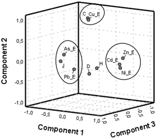 After checking the values of the communalities, it was finally decided to analyse 10 variables with extraction values of the communalities above 0.75, except for one value of 0.66. These 10 variables include the six PTEs considered, in their solid salt form (Ni, Cu, Zn, As, Cd and Pb), and the four groups of supergene minerals considered (divalent metal(loid) sulphate minerals, halotrichite group minerals, copiapite group minerals and jarosite group minerals). These analysed variables should make it possible to unravel the interactions between the different elements under consideration and the secondary minerals. Table 6 shows the PCA results for the variables mentioned above for the salt crust samples studied.