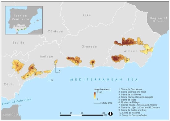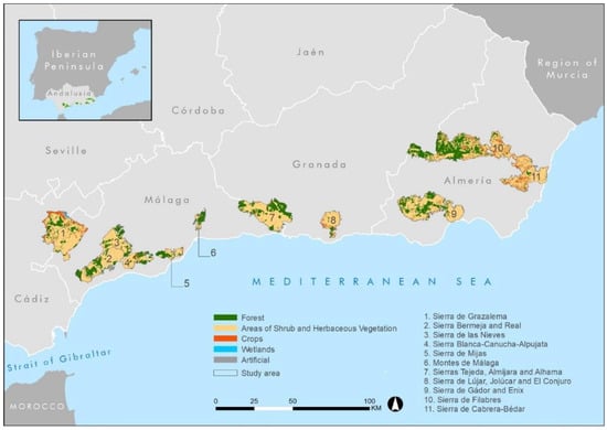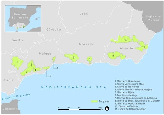 In relation to their degree of protection and management, as natural spaces, in order of relevance, the Sierra de las Nieves National Park stands out, declared in Law 9/2021 of the Spanish state, due to the large floristic inventory (more than 1400 species of plants), of which fifteen species of flora are threatened because they are unique or scarce. This is the case of the Spanish fir or the high mountain gall oak. In addition, the study area includes several Natural Parks: Montes de Málaga, Sierra de Grazalema (Law 2/1989, of 18 July 1989, of the Andalusian regional government), Sierras Tejeda, Almijara, and Alhama (Decree 191/1999, of 21 September 1999, of the Andalusian regional government). All these areas have justified their protection and management on the basis of their flora and/or by constituting a series of functions as a bioclimatic island, fundamentally in the easternmost areas of the study area: Sierra de Cabrera and Bédar, Sierra de Filabres, and Sierra de Gádor and Enix, or by having a series of protective functions for the population, as in the case of Montes de Málaga and its reforestation pine forest in the interest of reducing the historical floods that flooded the city of Málaga.