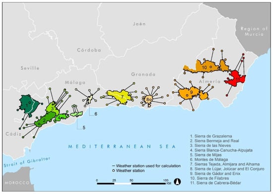 The selection of the natural areas that we have made responds to the fact that our intention is to observe the precipitation variability in and the spatial distribution of the droughts. Different studies have shown that there is a pattern of rainfall propagation in southern Spain, which goes from west to east in the southern sectors of the Iberian Peninsula [,]. The spatial propagation of precipitation also shows the influence of the relief on the space studied, caused by the main mountain systems. According to some studies, the spatial spread of droughts also shows the effect caused by the main relief features in the space studied [,]. In the west, in the province of Cádiz and Málaga and the inland, we find the Serranía de Ronda and the Sierra de las Nieves, where the natural areas of Sierra de Grazalema and Sierra de las Nieves are located; towards the sea, we find the natural areas of Sierra Bermeja and Real, Sierra Blanca, Canucha and Alpujata, and Sierra de Mijas. In the center and extreme east of the province of Malaga, the natural areas of Montes de Málaga, Sierra de Tejeda, Almijara, Alhama, Sierra de Lújar, Jolúcar, and El Conjuro are located, already in the province of Granada that are configured as medium mountains. Moving eastwards, in the province of Almeria, the mountains are still parallel to the coast with a higher coastal chain where the natural areas of Sierra de Gador y Enix, Sierra de Filabres, Sierra de Cabrera y Bédar. See Figure 2 to observe the configuration of the relief in the selected areas.
