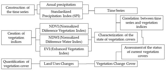 The method developed has been based on a series of requirements. First, it has been thought that the variables have a tracking capacity, since they are expected to have a relatively short response time so that it can allow for the adaptive management and follow-up and for an early detection of the changes. Second, the establishment of the reference conditions and the range of variability on which to evaluate the changes suffered by ecosystems represents a key aspect for the evaluation of their state of these. Therefore, the variables set out below have been used, and through which the conditions of the vegetation covers are defined in a temporal evolution [,,,,,,,]. The applied method follows this process, see Figure 5.