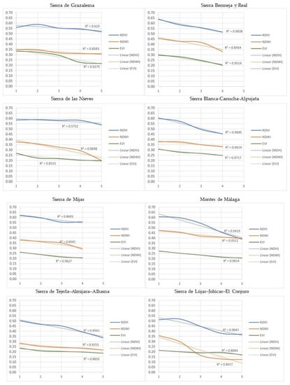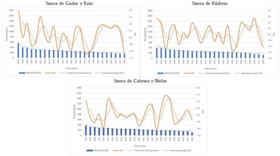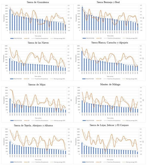 The temporal evolution of the annual precipitation was obtained for the 25-year study period. The mean annual precipitation has been observed in Table 4. The moving averages and autocorrelation treatments allowed for identifying a different cyclicity in the years 1997, 2010, which were especially wet, and 2018, highlighting these years in all the natural areas analyzed. Additionally, on the contrary, 2005 was a very dry year, with values 40% below being the average in the rainiest natural areas: Sierra de Grazalema and Sierra Bermeja and Real. Additionally, the areas with especially low rainfall in natural areas with lower precipitation values were Sierras de Lújar, Jolúcar and El Conjuro, Sierra de Gádor and Enix, Sierra de Filabres, Sierra de Cabrera, and Bédar, where records that year did not reach 200 L per m2.
