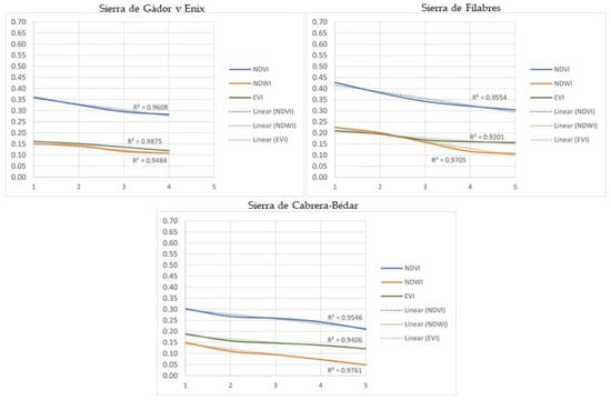 As is known, each vegetation index has limitations. In the case of the NDVI, it has been found that it is sensitive to the effects of the soil and the atmosphere; it is therefore advisable to apply other additional indices for a more precise analysis of the vegetation. To that end, we have applied an Enhanced Vegetation Index (EVI), which is like the Normalized Difference Vegetation Index (NDVI) and can be used to quantify the vegetation greenness [,,]. However, the EVI corrects for some atmospheric conditions and canopy background noise and is more sensitive in areas with a dense vegetation. To do this, using this index, the difference in the radiance between the blue and red bands is calculated [,]. These indices are of the general form (Equation (4)):