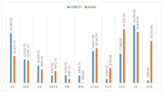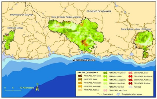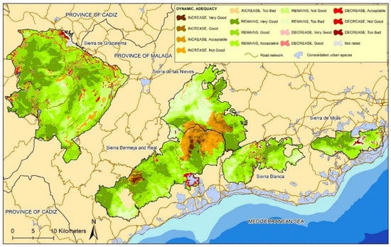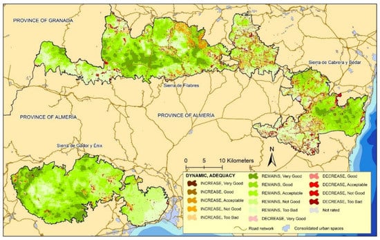 At this point we have been able to observe that the surfaces of vegetation coverts the forest and areas of the shrub and herbaceous vegetation which have remained in a large proportion. These represent the following proportions with respect to the total of each natural area: Sierra de Grazalema, 84.34% (44,736.94 has of 53,041.19 has); Sierra Bermeja y Real, 93.26% (26979.90 has of 28,928.70 has); Sierra de las Nieves, 97.33 % (17,902.97 has of 18,394.30 has); Sierra Blanca, Canucha, and Alpujata, 91.94% (11,200.55 has of 12,182.06 has); Sierra de Mijas, 84.99% (6633.10 has of 7804.46 has); Montes de Málaga, 92.94% (4643.15 has of 4995.60 has); Sierra de Tejeda, Almijara, and Alhama, 97.16% (38,940.25 has of 40,078.15 has); Sierra de Lújar, Jolúcar, and El Conjuro, 87.24% (11,088.71 has of 12,709.90 has); Sierra de Gádor and Enix, 96.29% (48,444.39 has of 50,312.93 has); Sierra de Filabres, 88.85% (63,674.15 has of 71,665.37 has); and Sierra de Cabrera y Bédar, 76.91% (25,919.70 has of 33,703.49 has). For the total area of study, this proportion amounts to 89.92% (300,163.80 has of 333,816.15 has). These figures can be seen in Figure 11.