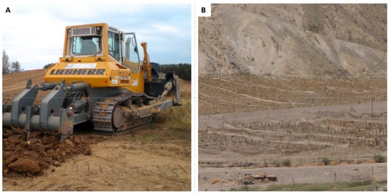 Soil preparation in the study area: (A) shows intensive processes with agricultural machinery; (B) shows soil preparation performed processes performed by small farmers. Sources: (A) available in https://www.goharvest.cl/movimientos-de-tierra/ (accessed on 29 October 2022), (B) authors’ own photograph.