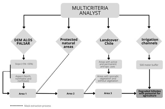 To classify the hillside systems’ areas with the proper slope, exposition, and altitude of the study area and then identify which of them represent the degraded areas that require restoration, an integrated analysis was performed. This analysis included morphometric parameters, land cover/use, and legal protection status. Before identifying the hillside systems suitable for agriculture, the entire study area was classified to first obtain all the areas that did not represent areas with slopes (slope < 5%) using DEM Alos Palsar. Then, the product “Land cover of Chile” was reclassified selecting land cover types to identify the areas that should be conserved based on their ecological value. Finally, the degraded hillside systems that could be recovered for agricultural purposes were classified. All the steps are based on limitations or exclusionary zones defined in Table 1, considering national and international experiences [23,24,25,26]. They are mainly oriented to two criteria, one in relation to topography and the other in relation to land cover (IUCN and WRI, 2014). For the first criterion, three variables were established (altitude, slope, and exposure) that make suitable hillside systems for agriculture [23]. Regarding the slope, a suitable arable area was established between 5% and 30% [27,28], the ideal exposure was the exposure oriented to the north, to the northwest and northeast. With respect to the altitude variable, in reference to the predominant crops, 1300 masl [27,29] was considered an adequate maximum altitude due to feasibility issues related to irrigation, as cultivation occurs only to 500 m above the irrigation channels. The first step was to intersect slope and exposure variables, obtaining “area 1”. “Area 1” was then intersected with the set of “natural protected areas”, giving rise to “area 2”. “Area 2” was intersected with the “land cover” product from which the areas with agricultural potential were selected, obtaining “area 3”. Finally, “area 3” was intersected with the area covered by irrigation canals, considering a buffer area of 500 m. The first two variables were grounded on DEM Alos Palsar. GIS analyses were performed in ArcGIS 10.6 using spatial analyst tools such as “intersect”, “extract by attributes”, “extract by mask”, “reclassify”, “buffer”, “aspect” and “slope”. The methodological process and criteria are presented in Figure 3 and Table 1.