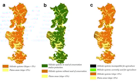 Description of the structure and dominant coverage in the landscape of the coastal mountain range: (a) shows the hillside systems and plains areas; (b) shows the hillside systems in need of conservation due to their natural vegetation cover and the hillside systems that do not need conservation; (c) shows the hillside systems unsuitable (incompatible) for agriculture and those currently used for agriculture.