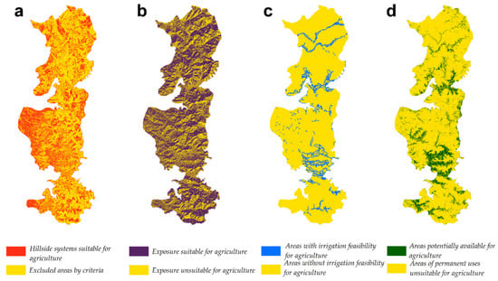 Spatial representation of the criteria used for the integrated analysis of hillside systems: (a) shows the hillside systems suitable for agriculture; (b) shows the exposure suitable for agriculture; (c) shows the areas suitable for agriculture according to the feasibility of irrigation; and (d) shows the areas potentially available for agriculture because they do not have other permanent uses. The yellow color represents the excluded areas according to the selected criteria.