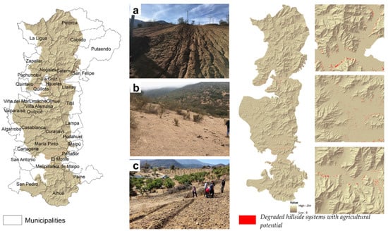 Spatial representation of the result of the integrated analysis of criteria to establish areas with potential for agricultural recovery or restoration, together with the communes belonging to the studied area. Photographs show: (a) hillside systems degraded by deforestation in Las Palmas (Olmue), (b) hillside systems degraded by agriculture and later abandoned (since 1982) in Roco (La Ligua), and (c) soil restoration activities applying the Keyline technique in Las Palmas (Olmue).