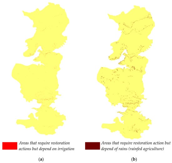 As already stated, the hillside systems that require restoration actions for agricultural use cover 3261.2 ha representing 0.3% of the study area and 0.4% of the hillside systems suitable for agriculture (see Figure 8a). As shown in Figure 8b, there are hillside systems that could recover only if sufficient rainfall and rainfed crops could be restored. If these rainfed hillside systems were considered, the area could be increased significantly, both for agricultural and natural conservation purposes. However, due to the current rainfall regime, linked to the prolonged drought in Central Chile, it is impossible to consider this scenario as feasible. Actually, there are few cultivated lands, covering only 1.2% of the total study area (Figure 9).