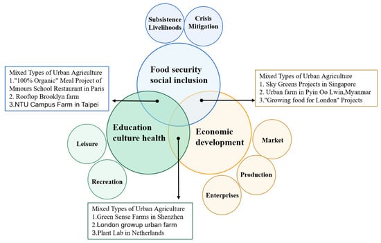 Urban agriculture is practiced worldwide, but mainly in high-income countries, especially in the United States, Canada, and Europe, where there is a focus on sociocultural benefits. Although urban agriculture is also present in low-income countries, it is mainly oriented toward market-oriented food production []. Specifically, Krikser et al. (2016) classified urban agriculture as belonging to three distinct, overlapping categories: self-supply, sociocultural, and commercial []. Self-supply mainly refers to growing vegetables and fruits on private balconies or in private gardens. Sociocultural urban farming activities are primarily for community or school campuses and community college gardens. Commercial mainly represents market profit, in which the operators are mostly adaptation companies producing agricultural products. Based on the above studies, urban agriculture can be divided into the following elements: food security and social inclusion, economic development, education, and cultural health. As Figure 1 shows, there are eight goals in urban agriculture, and many existing cases happen.