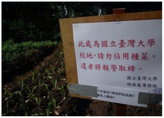 There are three paths to the development of urban agriculture in Taipei. The first is informal operation, which originates from the frugal culture of Chinese society. Food production has been a long-standing but often neglected activity in the city. People tend to plant in nearby public spaces, such as riverbanks, vacant lots, apartment balconies and rooftops. This informal planting is usually only visible to those who live or work nearby. In addition, the government’s water department and parks department prohibit unauthorized planting on public land along rivers and civic parks and will remove it immediately upon investigation. Further, municipal departments (such as hydraulic engineering and parks) prohibit unauthorized planting in civic parks and communal land along the riverside. Once verified, the plant will be removed immediately. This informal planting repeats often. An interesting case (Figure 4) involved a citizen who secretly planted vegetables on the campus of the National Taiwan University without permission. “This is the campus of National Taiwan University. Please don’t use it to grow vegetables. Otherwise, you will call the police and ban it.” (General Affairs Section of National Taiwan University, Taipei, January 2021). “Sorry, after we harvest these vegetables, We will retreat immediately.“(The citizen who stole vegetables, Taipei, 29 January 2021).