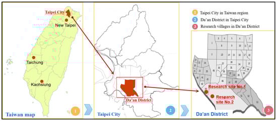 There are two cases in this study (Figure 6). In Case no. 1, the urban farm experiment and farm construction on the campus of National Taiwan University, located at Daxue village in Da’an District of Taipei City, was led by an author-led rooftop vegetable garden’s construction, with a year of action research as the data source. In case no. 2, the community farm was nearby the NTU, located at Xuefu village in the Da’an District of Taipei City. This urban farm was co-constructed by NGOs, the village department, and the students from NTU and National Taiwan Technological University.
