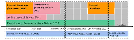 This study adopts participatory action research, where the actors are also participants in co-designing urban gardens through continuous communication to reach a consensus on urban garden design (including spatial arrangement, planting type, scale, and management style). Regarding timing, one of the authors planned and designed Case no. 1 as an organizer in 2014–2015 and participated in designing Case no. 2 as a community volunteer in 2015–2016. Among them, the community garden is still operating, and has been from its inception in 2015 to the present and has become an essential medium for community revitalization.