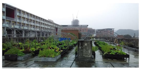 The Food Education Act (2005) was enacted in Japan in 2005, making “Shokuiku” (food education) the foundation of intellectual, physical, and moral education so that children can develop healthy eating habits, knowledge of diet, and good food judgment []. The United States Department of Agriculture (USDA) has been promoting the “farm to school” program since 2012, allowing public schools to procure ingredients from local farms to teach students about food production. Some schools have even set up vegetable gardens directly on their campuses []. In Taiwan, since the 1980s, tourist and civic farms have led to widespread attention to the issue of “food and farming education.” Urban agriculture policies have been introduced to primary, secondary, and university campuses since 2013. Among them, that of the National Taiwan University (NTU) is the most prominent, with the rooftop garden of the Department of Psychology, the rooftop garden of the Department of Sociology (Figure 15), and the Shaoxing Community Farm (located on the NTU campus).