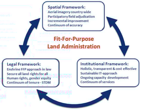According to Enemark et al. [12,14], the spatial framework establishes a cost-effective and feasible method of dividing land into spatial units and is a foundation for registering land rights. The legal framework provides fit-for-purpose innovative and flexible land right registration techniques that need legal endorsement. The institutional framework proposes policy frameworks for an efficient and accountable institutional setup to deliver transparent and accessible land information for all.