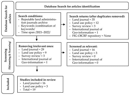 The search yielded thirty-five (35) articles from Land (including the items in the two volumes), twelve (12) papers from LUP, three (3) from SR, and one (1) from IJGI. The search for the FIG-OICRF repository delivered no results. Non-relevant publications are weeded out by swiftly skimming and scanning (probing a bit deeper) the title and abstract of each article, a time-honored approach to quickly reviewing and getting the substance of a document [34]. Thus, a total of 19 articles from the Land (16) and LUP (3) journals are identified, which focus on FFLA practical country implementations (13) and conceptual innovations (6), and thoroughly examined (Figure 2).
