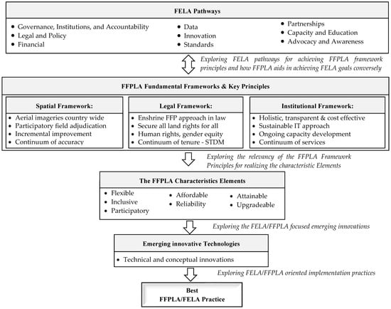 The UN-endorsed FELA guides member countries in building, improving, or monitoring their land administration systems. It could be aligned with the FFPLA approach and enhance its implementation, thereby achieving the FELA pathway goals. Furthermore, emerging innovations and ICT solutions promote the FFPLA approach by providing inexpensive, reliable, and faster tools for tenure mapping and security services [13,43]. Best FFPLA implementation practices are anticipated to integrate and realize FELA pathways and FFPLA framework principles, supported by FELA/FFPLA-focused contemporary innovations and conceptual developments.