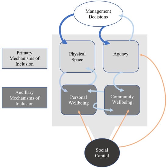 Conceptual framework detailing the interactions between garden management inputs, the analytical categories from our study, and the outcome of social capital. The dark blue arrows document the impacts of management decisions on mechanisms of inclusion. The light blue arrows indicate feedback relationships between gardener activities and the mechanisms of inclusion. The orange arrows indicate scholarly connections between social capital and the mechanisms of inclusion [,].