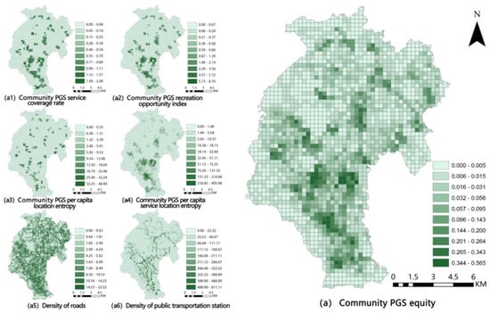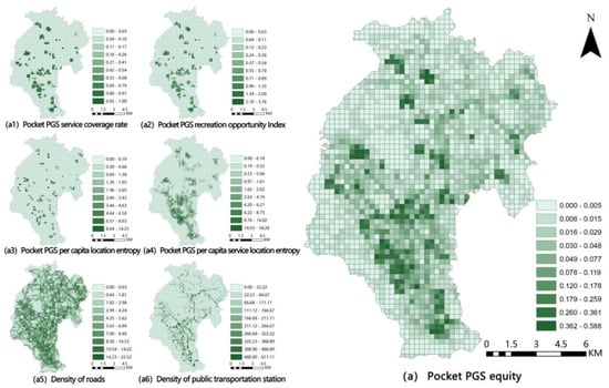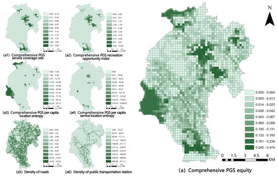 In terms of number of spatial arrangements, we chose per capita green space location entropy (X3) and per capita green space service location entropy (X4) indexes. X3 reflects the level of PGS resources enjoyed by each person in the grid, and X4 reflects the level of effective PGS resources that residents in the grid can enjoy within a 15-min living circle. Both of them can reflect the spatial matching between green space and population, and reflect the spatial equity of PGS. In terms of number of accessibility, we chose density of roads (X5) and density of public transportation station (X6) indexes. X5 reflects the total length of roads leading to the PGS in the grid, and X6 reflects the number of stations leading to the park in the grid, both of which can represent the accessibility degree to the park.