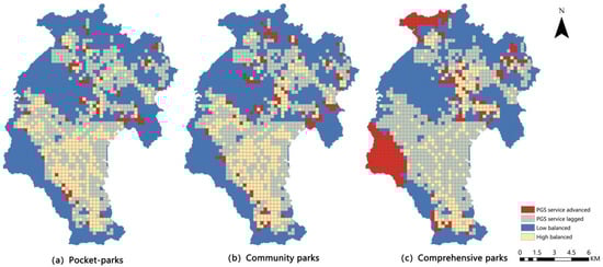 Uncoordinated-PGS advanced area indicates that the supply of PGS exceeds the total demand of PGS required by residents, but the development of the PGS and SED is not coordinated, and if not controlled, the spatial inequity of PGS will be exacerbated over time. It can be seen that there are two obvious uncoordinated-PGS advanced areas of comprehensive PGS (Figure 12c). This is because there is a large area of natural PGS in the area, and the service radius of these PGS can be improved by increasing the entrances, roads, and bus stations available to parks, so that more residents can enjoy their services conveniently.