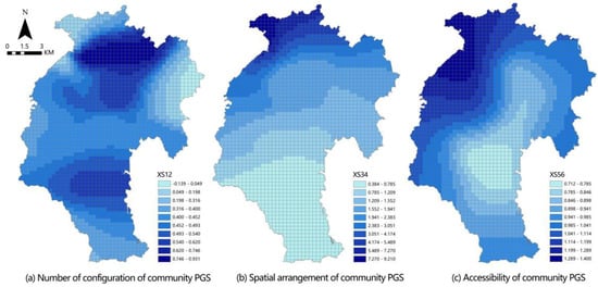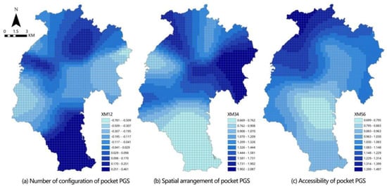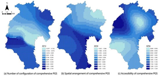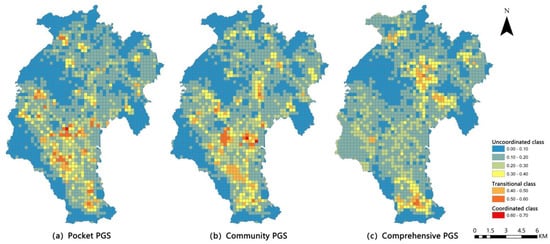 The indexes system was constructed to analyze the spatial correlation between three scales of PGS and coupling coordination degree (CCD). In this model, three CCD were taken as dependent variables. Six indexes of the PGS were taken as independent variables (Table 9). As can be seen from Table 10, for pocket PGS, the number of configurations is the subsystem that affects the coupling coordination degree (CCD) most (Figure 9). It is clear that residents in south area enjoy more pocket PGS than the north, and the number of pocket PGS and the distance from residential areas are key factors affecting the spatial equity of pocket PGS. The CCD of community PGS is similar to that of pocket PGS, but the biggest factor affecting community PGS is spatial arrangement, which indicates that in the northern area, community PGS should be arranged more within the 15-min living circle of the residential area, and more entrances and exits should be provided, so that residents can enjoy community PGS resources more conveniently (Figure 10). For comprehensive PGS, the southern area with high CCD is mainly affected by the number of configurations and spatial arrangement subsystems. The low CCD in the northern periphery is caused by the accessibility subsystem. Therefore, for comprehensive PGS, it is necessary to strengthen the connection between the northern periphery and the central area, as well as increase bus routes and bus stations, so as to enable a wider range of residents to enjoy comprehensive PGS conveniently and thereby increase spatial equity (Figure 11).